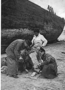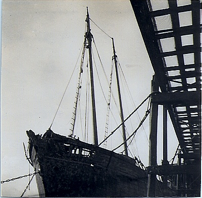 This was found to be difficult as the vessel was being washed daily by the tides and it was decided to blow several holes in her to allow the vessel to burn easier, and the attached photos show the Routledge brothers preparing the charges prior to placing them aboard.