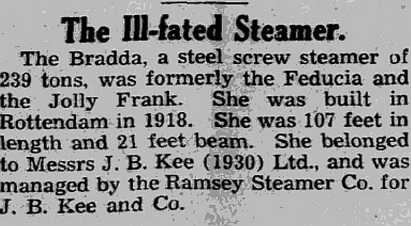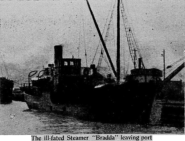 The Bradda was Dutch built in Rotterdam in 1918, she was 107 feet long and 21 feet in the beam, she had several owners prior to Messrs J B Lee of Ramsey purchasing her, and she was managed by the Ramsey Steamer Co, and used for carrying general cargo around the Irish sea.