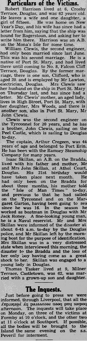 The Manx papers cover the disaster in great detail and a relief fund was set up for the families of the 5 men lost when she sank.